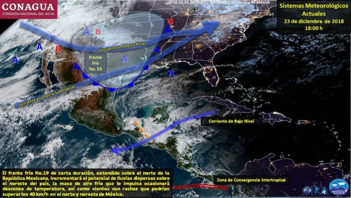 El meteorólogo Hugo Villa Obregón explicó que las condiciones del clima se deben al paso del frente frío no. 19, mientras que la alta presión y la masa de aire frío en proceso de modificación que cubre la mayor parte de la República Mexicana, Golfo de México y Península de Yucatán genera temperaturas bajas y heladas en la región montañosa, así como viento de componente norte.
