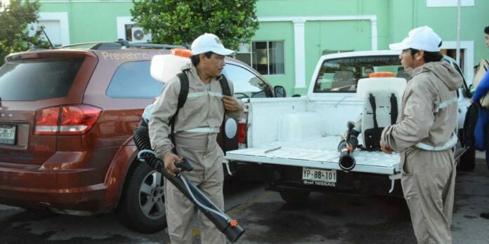 Cuadrillas de vectores de la Jurisdicción Sanitaria número 3 de Carmen y Palizada trabajan para fumigar, en el menor tiempo posible, las 150 colonias y fraccionamientos de la isla apoyados con unidades móviles y maquinaria pesada.