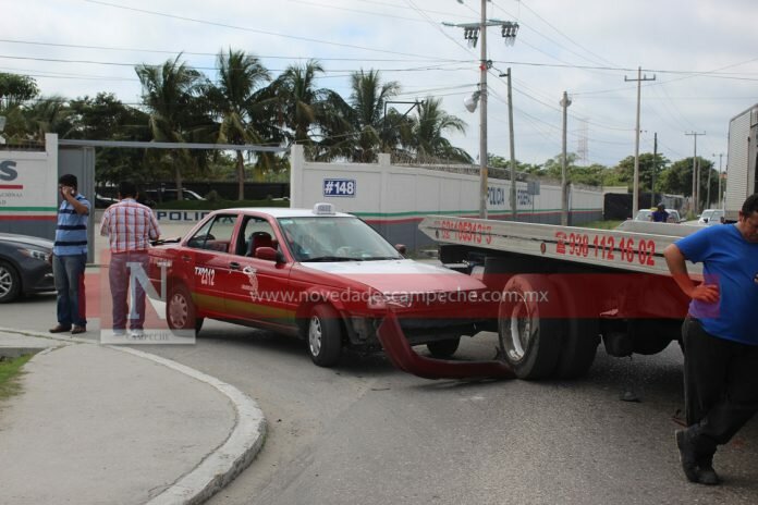 El percance se registró cuando el taxi de la marca Nissan, tipo Tsuru, marcado con el número 2312, con placas de circulación 8265-BFB del Estado transitaba por dicha calle y al llegar al cruce de la avenida Isla de Tris, en la colonia 23 de Julio en Ciudad del Carmen, cambió de carril sin precaución para rebasar, ocasionando que colisionara contra una grúa de la marca International, con matrícula 93-AG-3A del Estado.