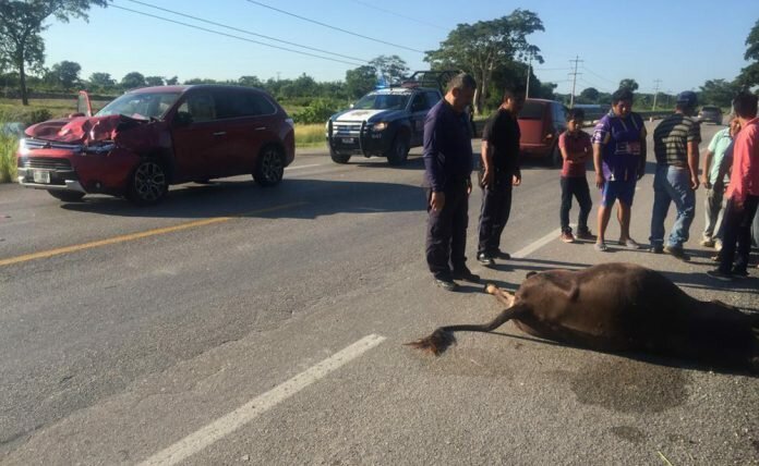Una familia que viajaba al estado de Quintana Roo, proveniente de Tabasco, vio interrumpido su camino luego de que la camioneta en la que se desplazaban chocara contra un animal, por fortuna todos los ocupantes de la unidad motriz resultaron ilesos.