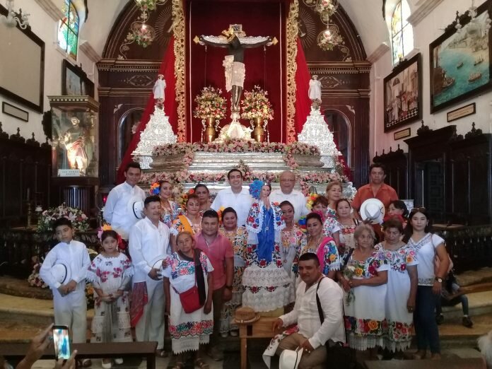 Al ritmo de jarana y con un desplegado de colores de ternos arribaron peregrinos de Umán, Yucatán al Santuario del Cristo Negro, Señor de San Román con la imagen de su patrona, la Virgen del Buen Viaje.